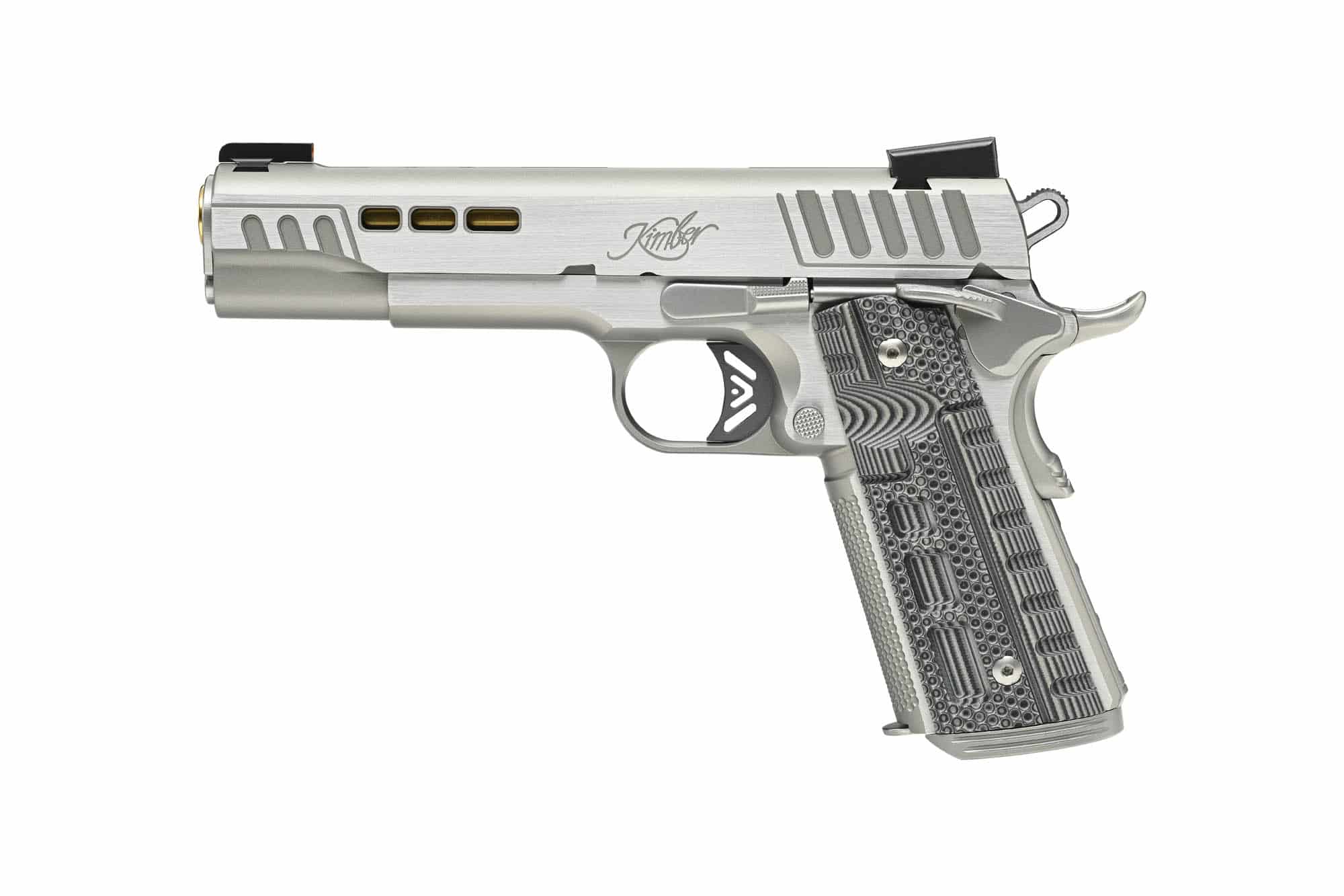 Les organes de visée Tru-Glo TFX Pro Day/Night, avec un anneau orange sur le guidon, garantissent une acquisition rapide et précise de la cible, quelles que soient les conditions d’éclairage. La carcasse et la glissière bénéficient d’une finition argentée KimPro II avec des faces polies, conférant au pistolet une allure élégante tout en assurant une protection contre la corrosion. Les plaquettes en G10 gris/noir, associées au pointillage Kimber Stiplex™ sur la sangle avant, offrent une adhérence optimale, même dans des conditions humides ou glissantes.